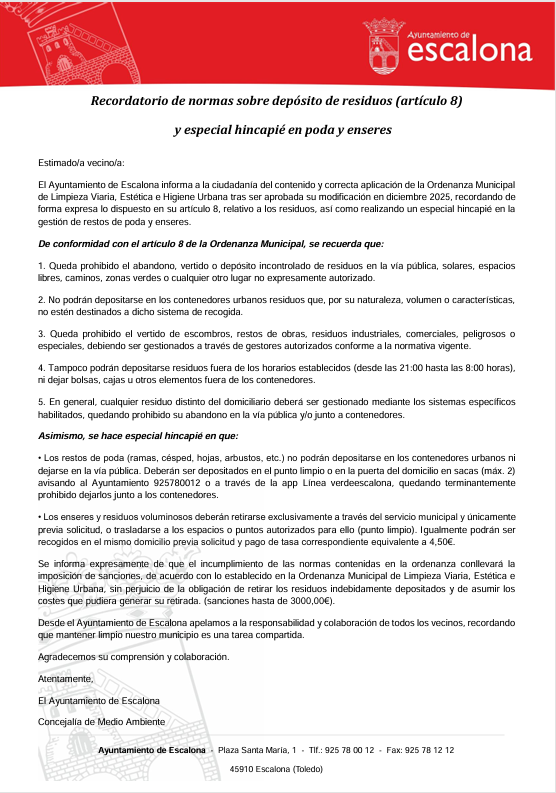 Estimado/a vecino/a: El Ayuntamiento de Escalona informa a la ciudadanía del contenido y correcta aplicación de la Ordenanza Municipal de Limpieza Viaria, Estética e Higiene Urbana tras ser aprobada su modificación en diciembre 2025, recordando de forma expresa lo dispuesto en su artículo 8, relativo a los residuos, así como realizando un especial hincapié en la gestión de restos de poda y enseres.